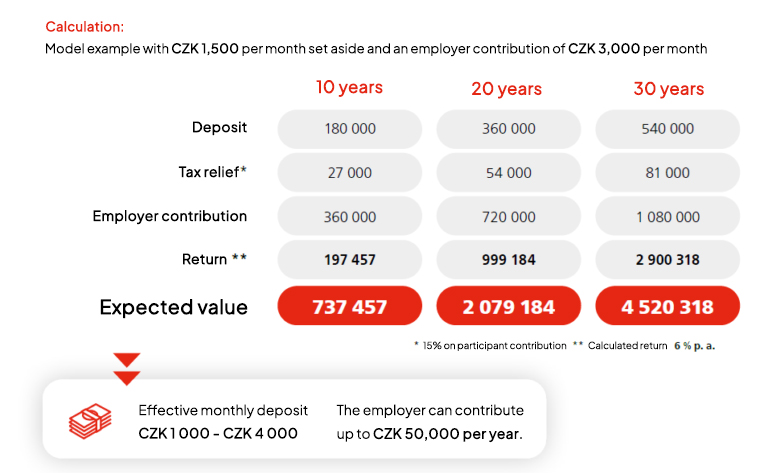 Employees and self-employed people can deduct up to CZK 48,000 of their LTIP contributions from their tax base per year. With an investment of CZK 4,000 a month, you’ll save a total of CZK 7,200 per year in tax. The limit of CZK 48,000 applies to all retirement security products combined.
